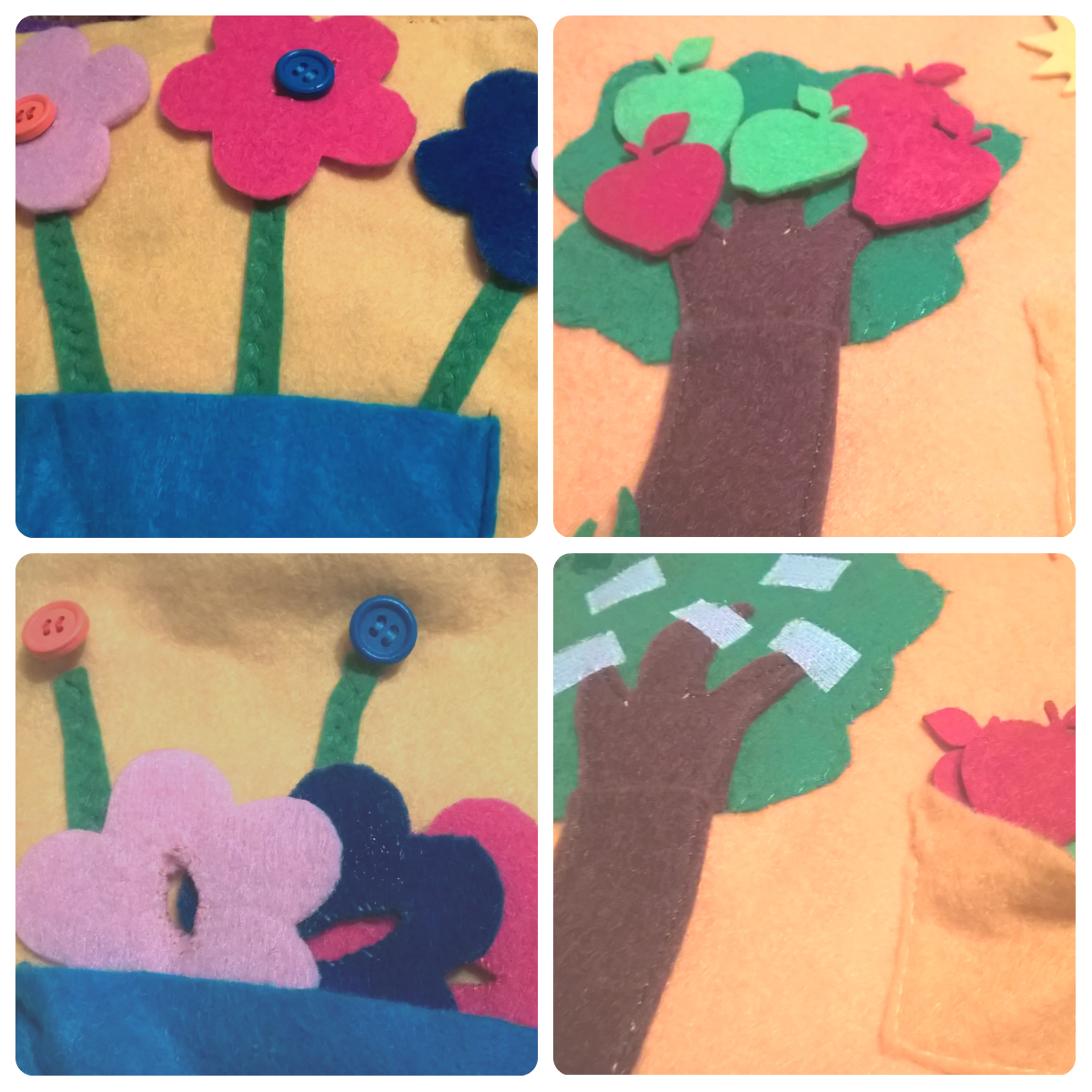 Paginile cărților senzoriale sunt lucrate din fetru, cu accesorii din fetru, lemn, nasturi, scai, capse sau mărgele, în funcție de fiecare activitate în parte. Se pot adăuga oricând pagini noi sau se pot scoate din paginile existente. Activitățile sunt diferite și dezvoltă abilitățile senzoriale ale copiilor, coordonarea mână-ochi. Sunt sprijiniți pentru a învăța cifrele, culorile, formele geometrice, activitătțle zilnice din casă și tot așa. În funcție de solicitările cumpărătorului, pot fi create povești, jocuri (puzzle, labirinturi), adunări și scăderi, calendar, ceas, alfabet. Imaginația este limita. Cărțile sunt recomandate începând cu 7-8 luni pentru o dezvoltare armonioasă și pentru a satisface setea de cunoaștere a copilului. Sunt deosebit de utile în cazul drumurilor, când este nevoie să captăm atenția copilului pe o activitate statică pentru o perioadă mai lungă de timp.”