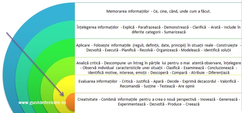 Vine copilul acasă cu tolba plină de Bine, Foarte Bine, 10 și ne bucurăm, sărbătorim, arătăm vecinilor ce copil deștept avem. Dar dacă ne uităm mai atent observăm că are un 10 pentru că este sârguincios, muncitor, așa că a memorat o poezie la Limba și Literatura Română, a descris cu lux de amănunte procesul de fotosinteză, a desenat după model un fluture, a scris impecabil după dictare și a aplicat corect regula de trei simplă într-un exercițiu. Practic, a folosit primele trei procese ale gândirii sau gândirea inferioară, așa cum o definește Bloom: memorarea, înțelegerea și aplicarea practică.
