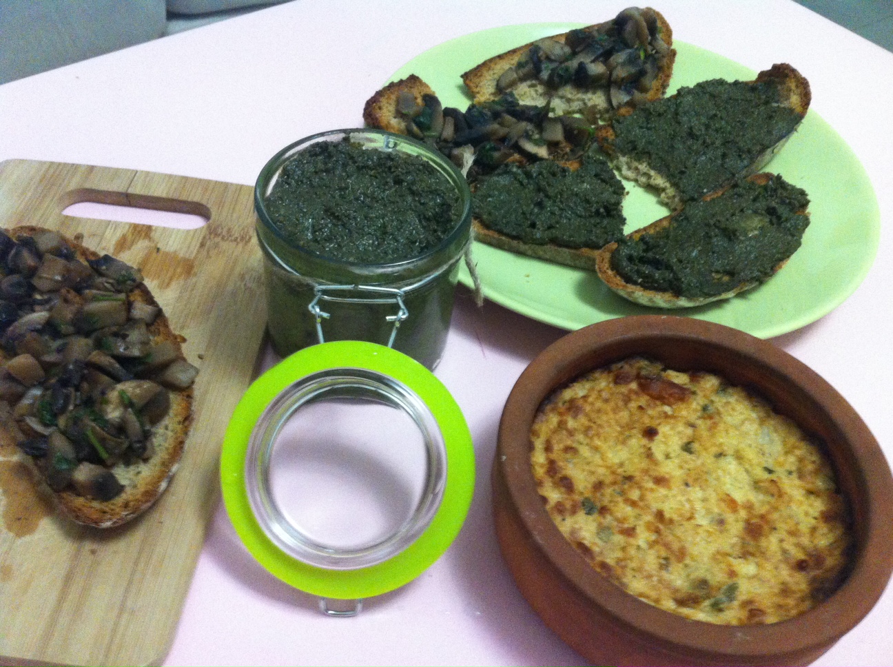 Un mic dejun ad-hoc, surprins fără pretenții artistice @pesto de urzici @souffle de conopidă cu făină de năut @ciuperci sote cu pătrunjel și usturoi